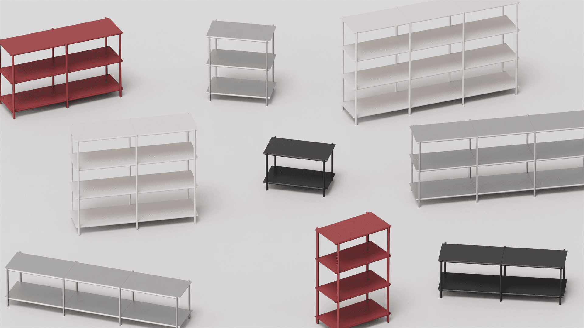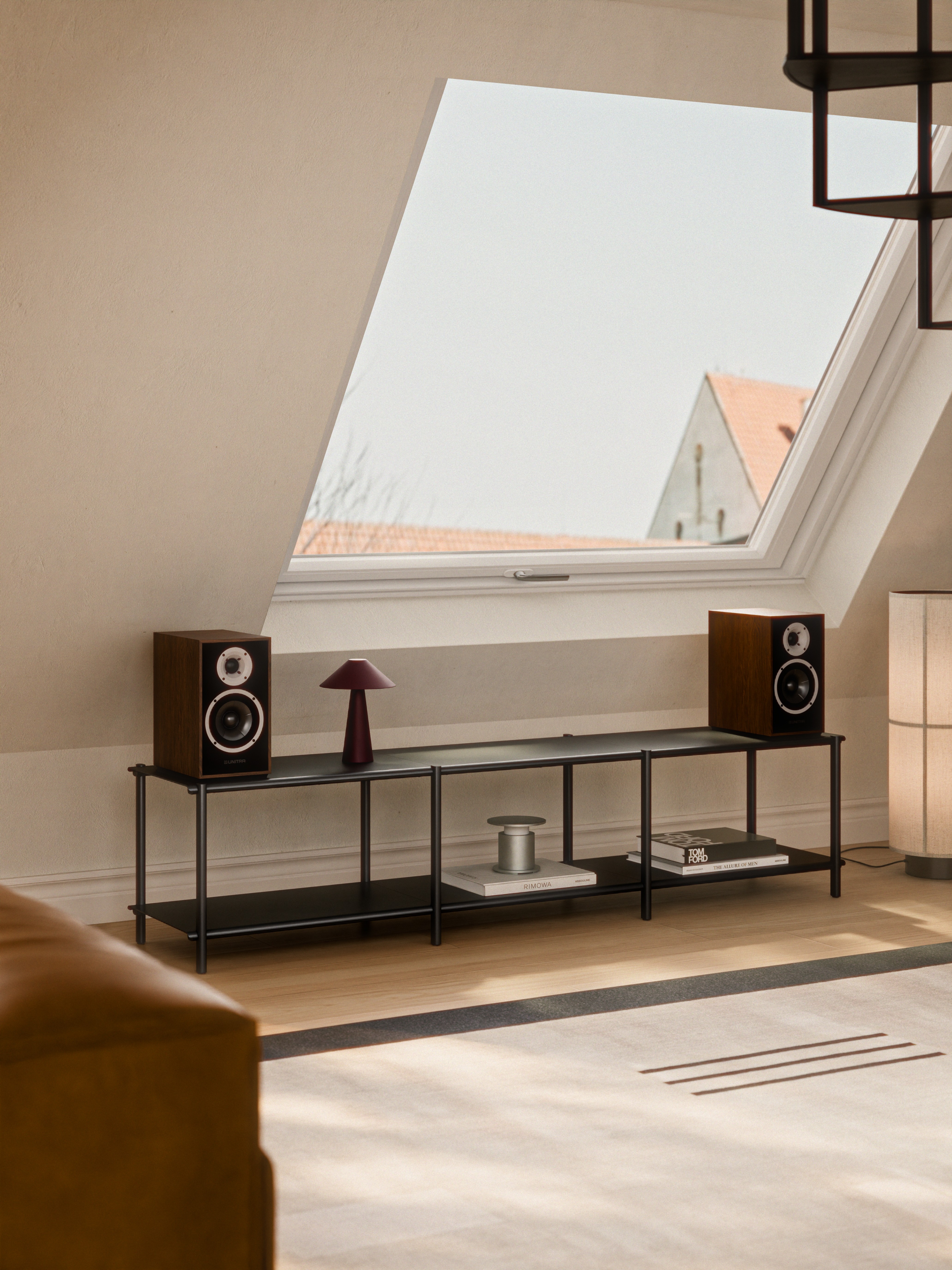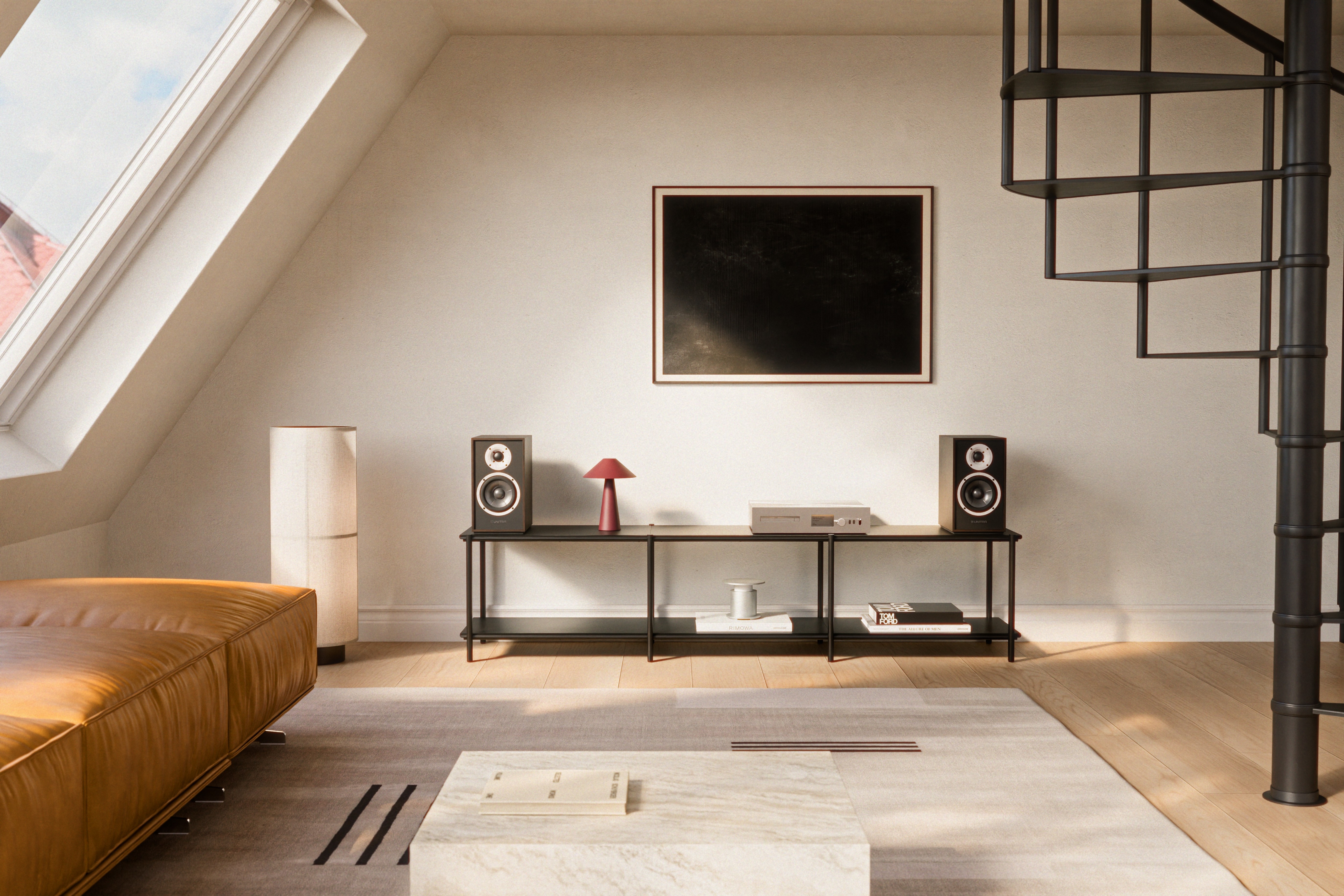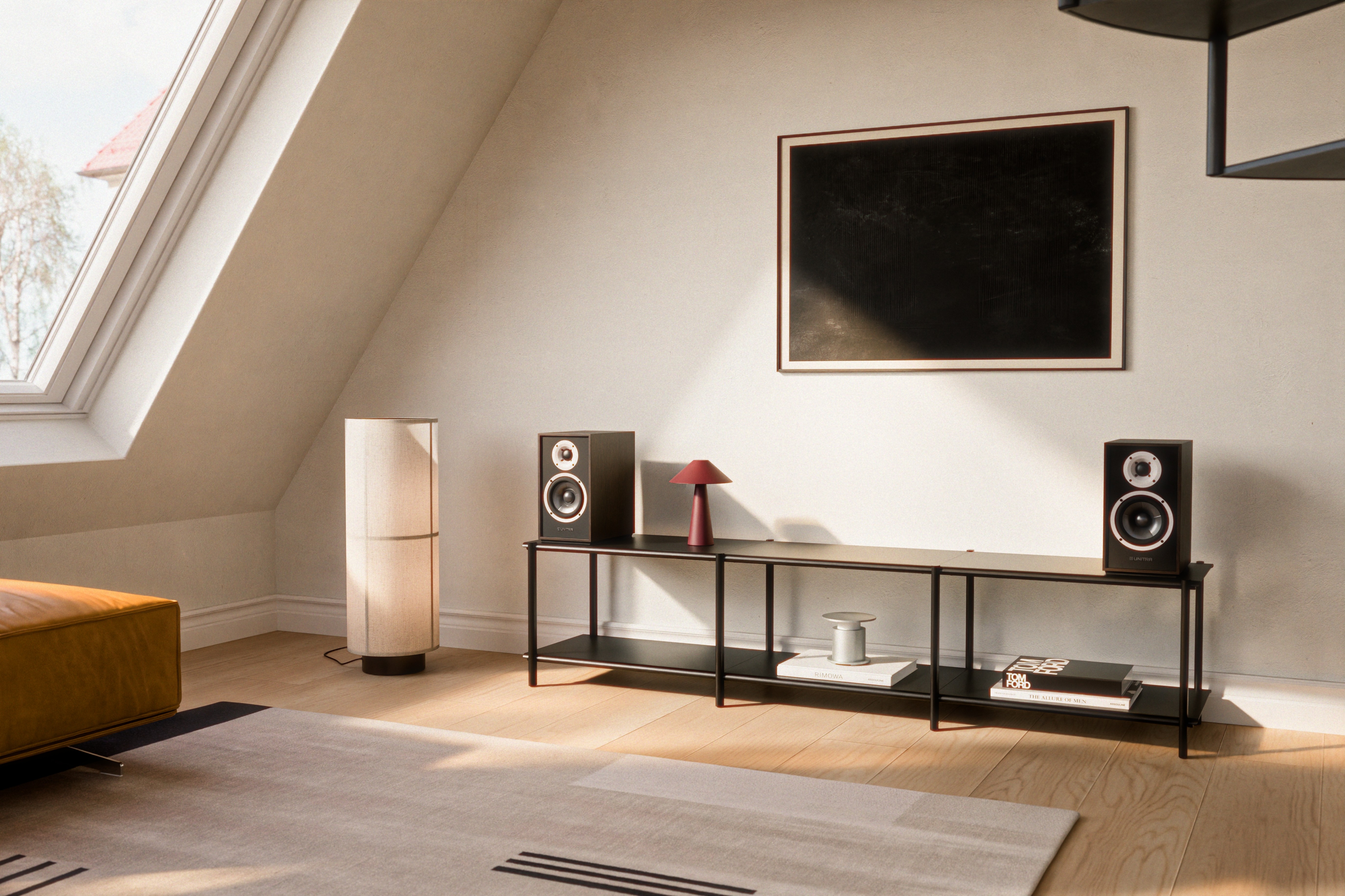 3D interiors were designed to show the product in a natural space. We focused on a soft, lived-in mood to show how the rigid aluminium frame fits comfortably into a space.